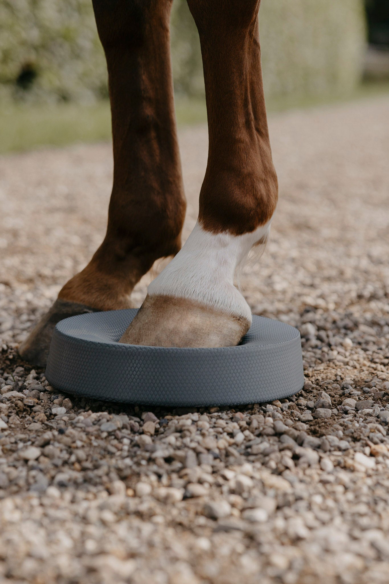 When a horse stands on a pad and puts weight on its hoof, the horse sinks gently into the pad. This creates an imbalance that it must constantly balance out. This can address physical and mental processes, including deep muscles and proprioception. This is often shown in a variety of body reactions, such as chewing. If the horse leaves the surface, the pad returns to its original shape.